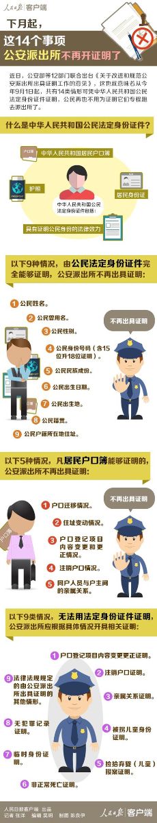 公安部等12個部門于近日聯合出臺《關于改進和規范公安派出所出具證明工作的意見》,自2016年9月1日起實施。12個部門還專門印發通知,就做好貫徹落實工作提出明確要求。 《意見》規定凡是…