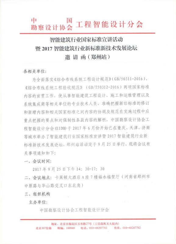 智能建筑行業(yè)國(guó)家標(biāo)準(zhǔn)宣講活動(dòng)暨2017智能建筑行業(yè)新標(biāo)準(zhǔn)新技術(shù)發(fā)展論壇邀請(qǐng)函(鄭州站)
