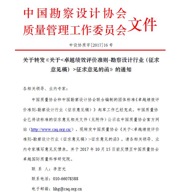 中勘協質量管理委員會關于卓越績效評價準則-勘察設計行業(征求意見稿)征求意見