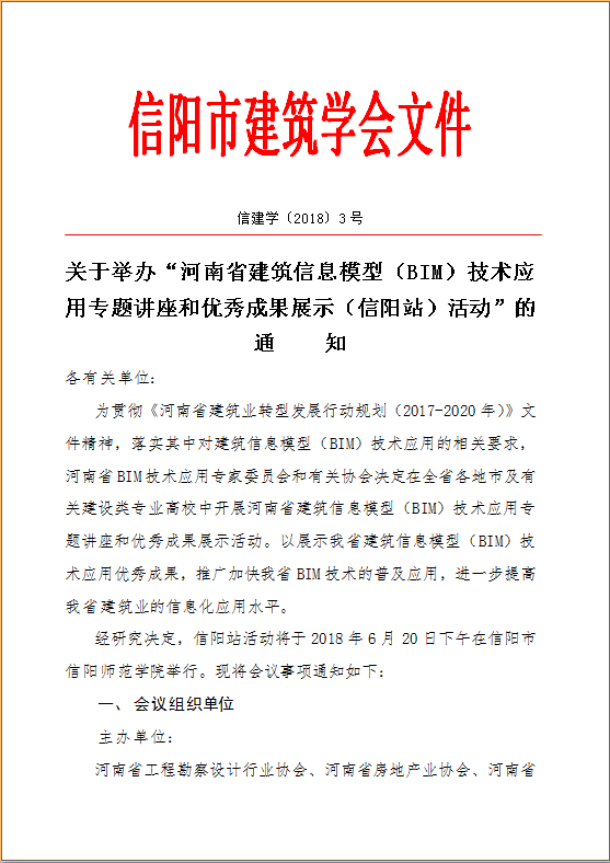 關(guān)于舉辦“河南省建筑信息模型(BIM)技術(shù)應(yīng)用專題講座和優(yōu)秀成果展示(信陽站)活動”的通知