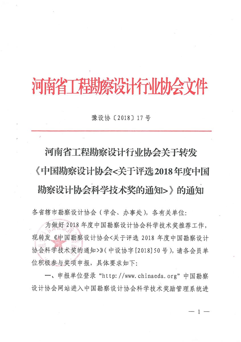 協會關于轉發《中國勘察設計協會<關于評選2018年度中國勘察設計協會科學技術獎的通知>》的通知
