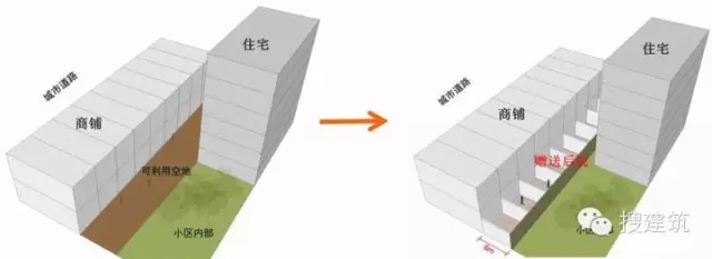 (利用住宅和商業退距贈送后院,后院圍墻同時是小區圍墻降低成本,這種后院對于餐飲、超市等業態有重要作用)