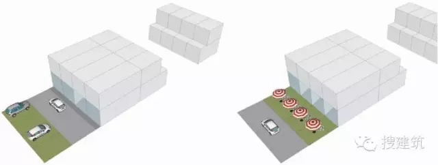 (商業外擺區是商業面積的一種拓展,也是商鋪廣告,對人流有引導作用,特別是對于有景觀資源的商鋪,這種外擺區的價值高于室內商鋪價值,圖例中利用停車位置換外擺區)