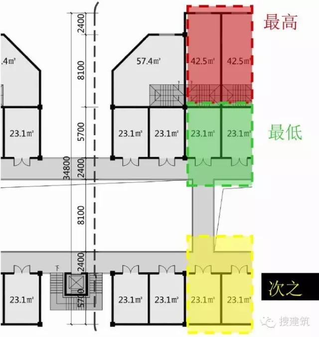 (直接面向街面的商鋪,人可以在路上直接看到,所以價值最高;最內側商鋪人流只能從“第一層皮”的“缺口”看到,價值次之;中間商鋪只有當人流進入內街轉過頭后才能發現,價值最低。商鋪面積的大小也根據商鋪價值大小遞減)
