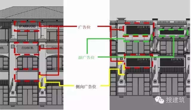 廣告位置(廣告位——遠觀,副廣告位——中觀,側向廣告位——近觀,廣告牌是商業建筑最主要、最重要的建筑元素,也是商業銷售主要手段)