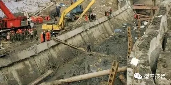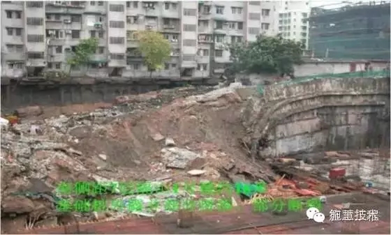主要是由于施工搶進度,超量挖土,支撐架設跟不上,是圍護體系缺少大量設計上必須的支撐,或者由于施工單位不按圖施工,抱僥幸心理,少加支撐,致使圍護體系應力過大而折斷或支撐軸力過大而破壞或產(chǎn)生大變形。下圖為2011年杭州某深基坑圍護樁折斷事故。