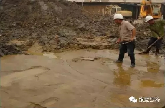 由于對承壓水的降水不當,在隔水層中開挖基坑時,當基底以下承壓含水層的水頭壓力沖破基坑底部土層,將導致坑底突涌破壞。下圖為上海某深基坑坑底內(nèi)發(fā)生承壓水突涌。