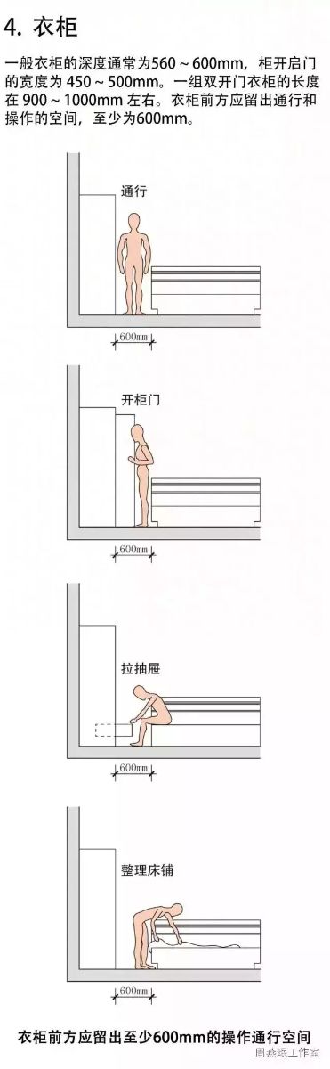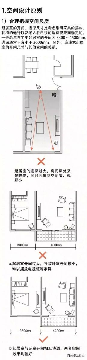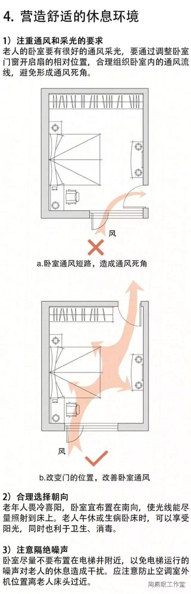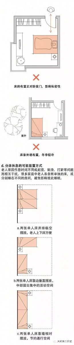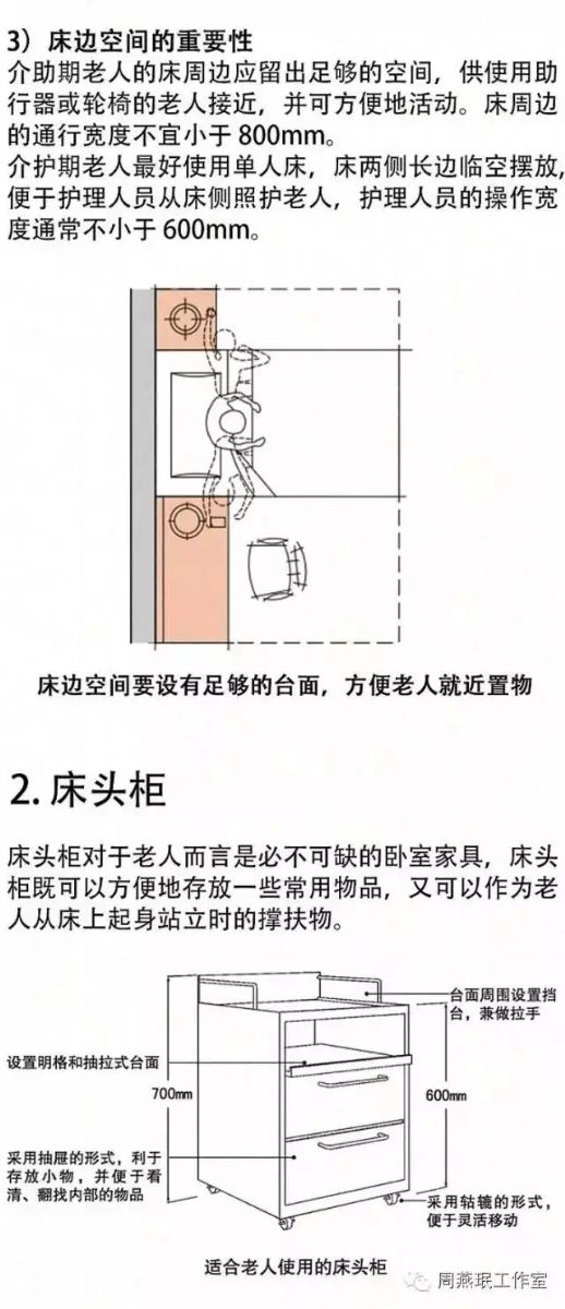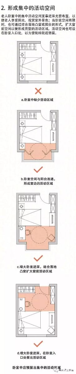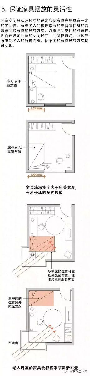 相對于中青年人群比較重視的臥室私密性,老人臥室更需要的是安全性和舒適度。因此,老人臥室的空間設計應遵循以下四大設計原則:保證適宜的空間尺寸,形成集中的活動空間,保證家具擺放的靈活性和營造舒適的休息環境。