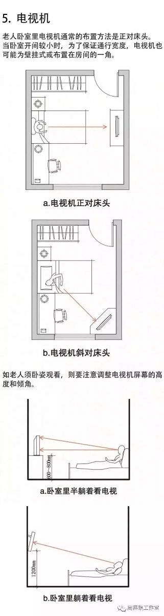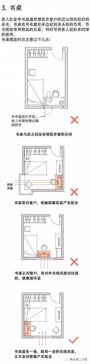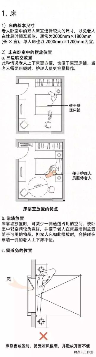 臥室在老年住宅中除了承擔老人常規的睡眠功能外,往往還會進行許多其他活動,例如閱讀報紙、看電視、上網等。對于行動不便的臥床老人而言,臥室更成為老人生活的主要場所。臥室中家具的選擇和擺放直接影響著空間的安全性和舒適度,讓我們來看看老人臥室中家具的學問。