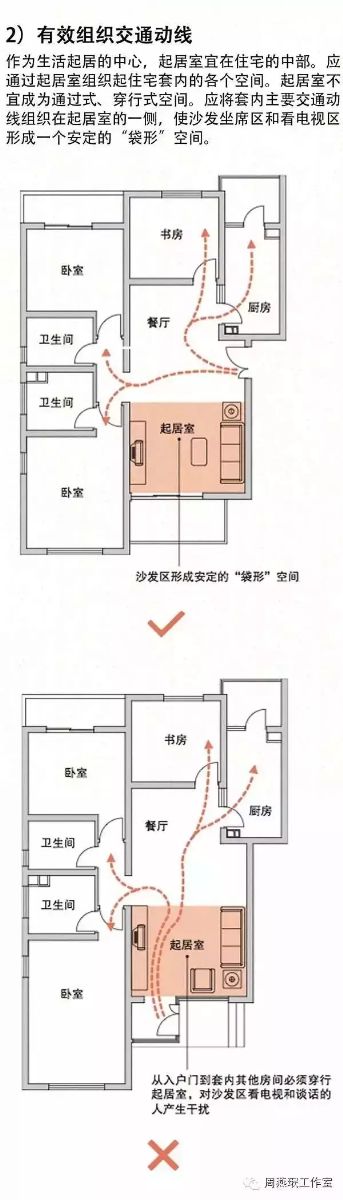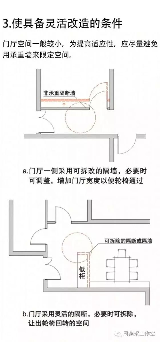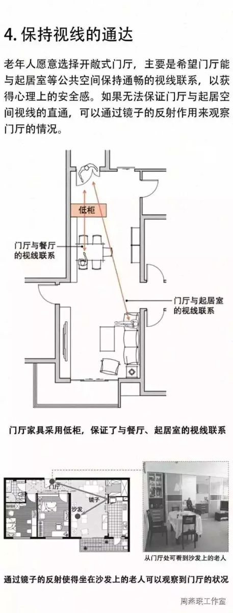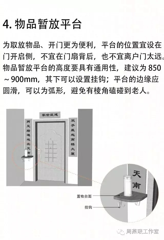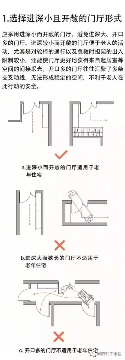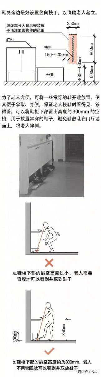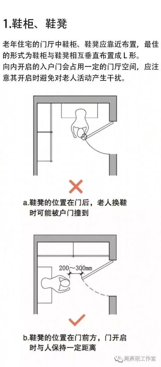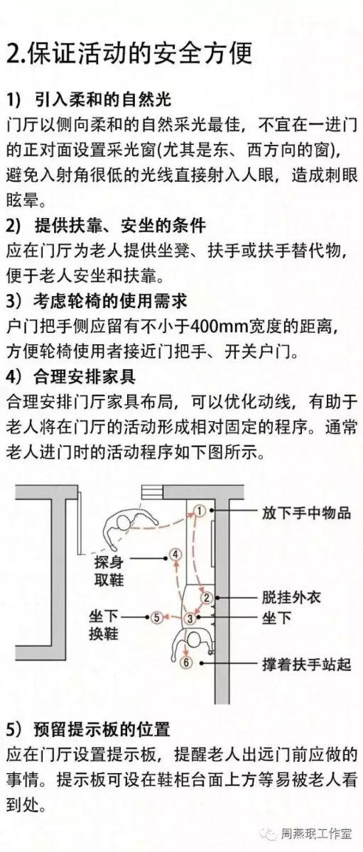 門廳在住宅中所占面積雖然不大,但使用頻率較高。老人外出或回家時,往往要在門廳完成許多動作,例如換鞋、穿衣、開關燈、拿鑰匙等。因此,門廳的各個功能須安排得緊湊有序,保證老人的動作順暢、安全。老年住宅的門廳空間設計通常需遵循以下五大原則。