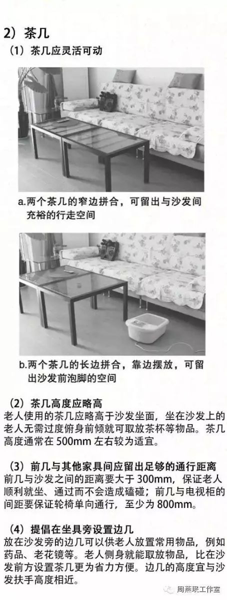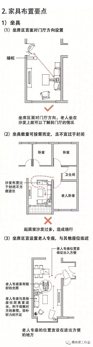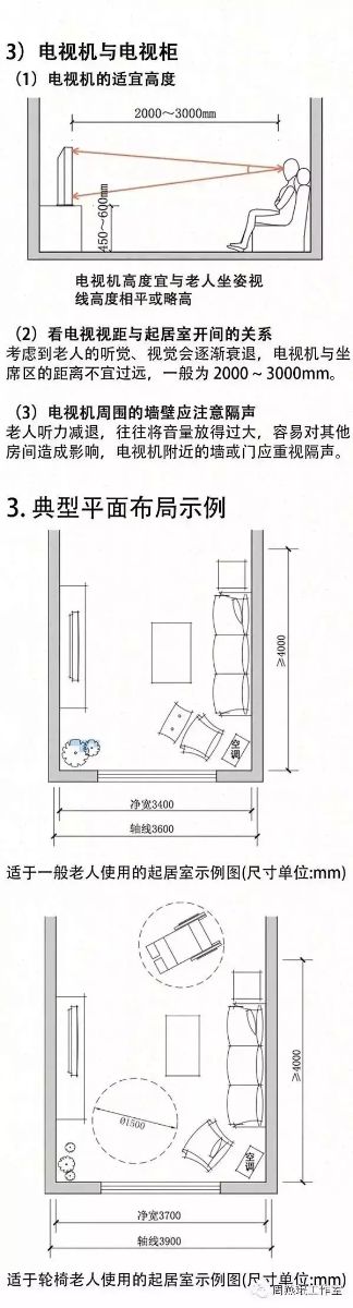 起居室是老人進行聊天、待客等家庭活動和看電視、休閑健身等娛樂活動的主要場所。在設計時,應迎合老人的心理需求和活動能力,促進老人和家人以及外界環境之間的交流。