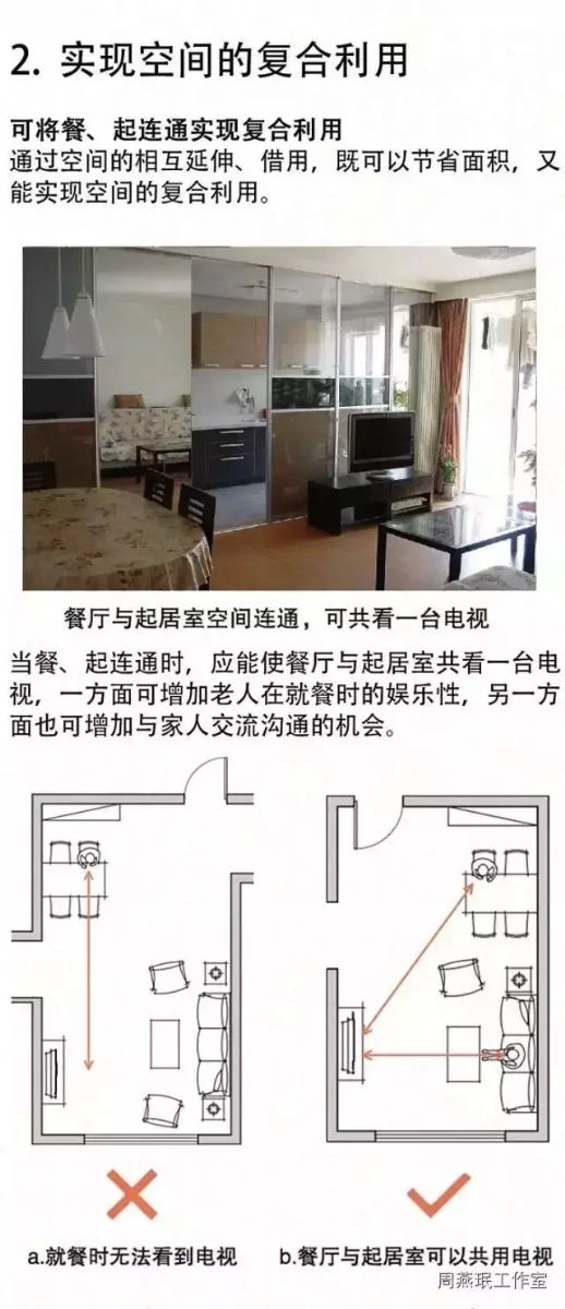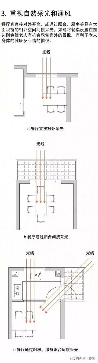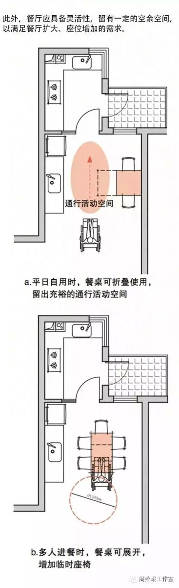 餐廳在老年人的日常生活中使用頻率較高,一日三餐是老人生活中十分重要的組成部分。除了備餐、就餐外,老人往往還會利用餐桌的臺面進行一些家務、娛樂活動,例如擇菜、打牌等。因此,餐廳成為了一個與起居室同等重要的公共活動場所。餐廳的設計應當遵循以下三大原則: