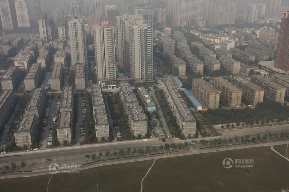 2013年10月05日,陜西省西安市,筆者搭乘直升機(jī)從大明宮遺址公園西側(cè)上空飛過(guò),在空中見(jiàn)大明宮西側(cè)一條新修的路被6棟新蓋的樓擋了一半路面,以前只見(jiàn)過(guò)老樓、釘子戶擋了路,新樓擋新路還是頭一回見(jiàn)到。魏永賢 攝