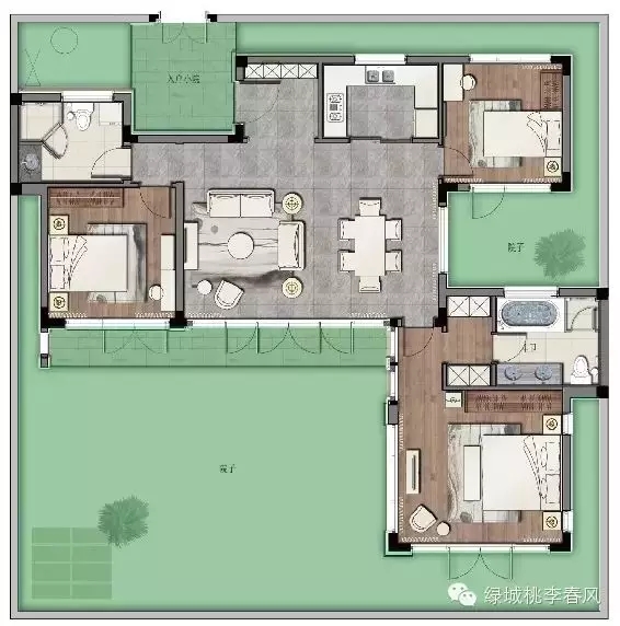 多重院落設計一直是桃李春風被家人們津津樂道的話題之一,無論是入戶小院的乘興而歸、圍合式院落的信手借景、天井小院的禪意頓生或是中庭院落的大宅氣韻,都構建起一副妙趣橫生的中式生活美學。