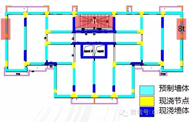 標準層:外墻板22塊,內墻板13塊,疊合板46塊, 8t預制懸挑構件11塊,其他預制構件10塊,共計102塊,其中外墻板為擠塑聚苯板復合夾芯板,最大構件重量為8t,樓梯為4t。現澆混凝土用量63.46m³。