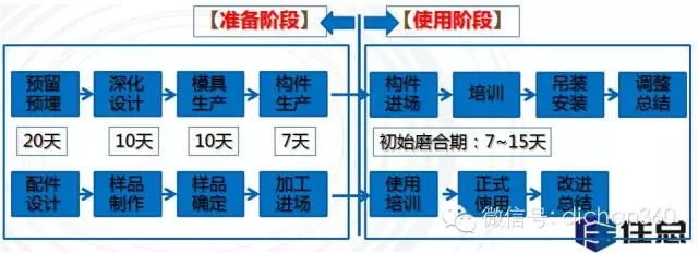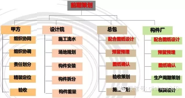 住宅產業化前期策劃主要包括【前期準備階段策劃】和【使用階段策劃】。施工單位主要策劃內容:“塔吊選型、構件存放、鋼筋定位、工具設計、支撐體系、構件安裝工藝”等工業化前期策劃工作,確保后期頇利實施。