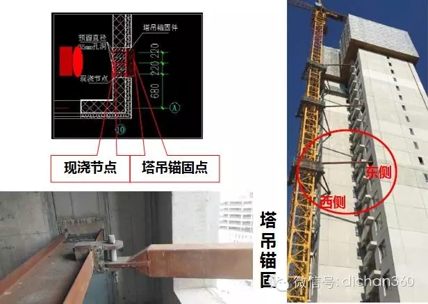2#裝配式住宅樓墻體為預制構件,塔吊采用不現澆節點錨固的方式,西側錨固點在現澆節點處預留錨固鋼板,東側錨固點設置在房間內,采用現澆節點預埋鋼梁方式錨固。