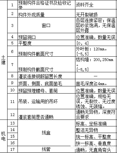 構件進場時,項目棟號工長組織材料、質量、實測、技術共同對構件外觀、質量、尺寸等項目進行聯合驗收,土建驗收項目12項,水電驗收項目5項。
