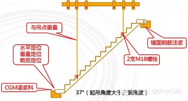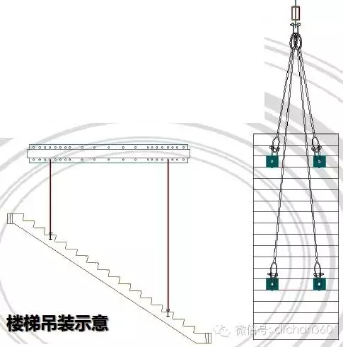 支點不吊點同位;支點木方高度考慮起吊角度;樓梯到場后立即成品保護;