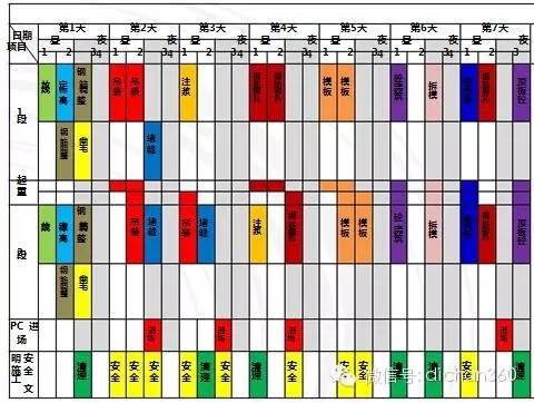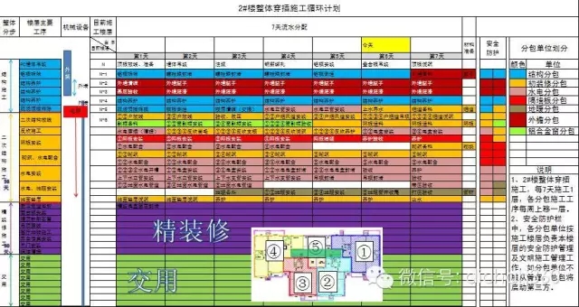工程實施階段,項目部根據整體網絡施工進度計劃圖,編制“整體穿插施工循環計劃表” 將結構施工、初裝修施工、精裝修施工、外檐施工所有工序進行排序、銜接,通過工序的有效銜接,將各分包各工序計劃的準確度進行鎖定,項目部將進度計劃張貼于現場,實現進度控制可規化,通過每天各工序進度確訃,實現多道工序、多家分包“同時、有序、準確”施工。