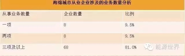 按照行業的一般特征,將海綿城市業務內容分為規劃、設計、設備、材料(建材)、施工、運營、模擬、投融資和綜合類(參與三項以上),對初步調研的企業進行分類統計。84家初步統計的企業當中,通過對從事的業務數量分析,81.0%以上都能夠承擔三項以上的業務能力,承擔一項的主要是材料(建材)和模擬;承擔兩項的主要是設備、施工等。