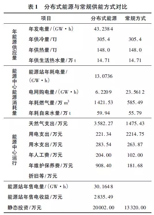 在機場總供能面積為74 萬m2、年供冷量、年供熱量、年供生活熱水量相同的條件下,分析對比分布式能源供能與機場常規供能方式的技術經濟性( 見表1) ,常規方式采用燃氣鍋爐+ 電制冷方式。