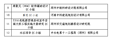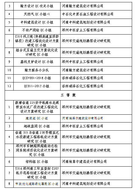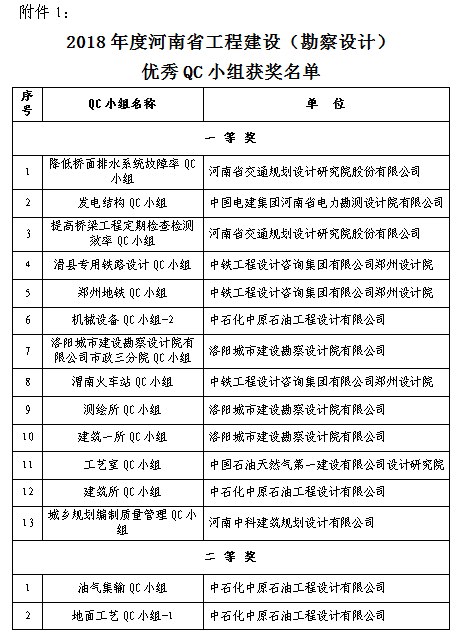 附件:1. 2018年度河南省工程建設(勘察設計)優(yōu)秀QC小組獲獎名單