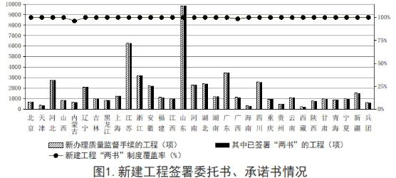2019年第二季度,全國新辦理質量監督手續的工程共56860項,其中,已簽署法定代表人授權書、工程質量終身責任承諾書的工程有56817項,覆蓋率為99.92%,北京市、天津市、河北省等29個省(區、市)和新疆生產建設兵團覆蓋率達100%,內蒙古自治區、廣西壯族自治區未達到100%。