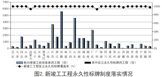 2019年第二季度,全國新辦理竣工驗收備案工程36147項,其中,有36013項工程設立永久性標牌,覆蓋率為99.63%,安徽省、河南省、湖北省等26個省(區、市)覆蓋率達100%,廣東省、廣西壯族自治區、西藏自治區、內蒙古自治區、新疆維吾爾自治區和新疆生產建設兵團未達到100%;有35265項工程建立質量信用檔案,覆蓋率為97.56%,黑龍江省、貴州省、青海省等24個省(區、市)覆蓋率達100%。