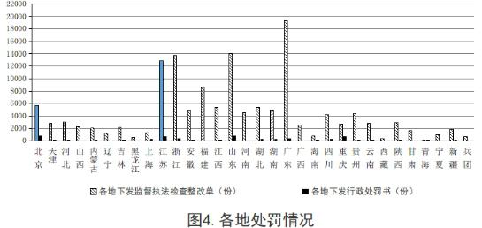 2019年第二季度,各地共下發監督執法檢查整改單140739份、行政處罰書6854份,處罰單位5910個,處罰人員1723名。其中,省級住房和城鄉建設主管部門下發監督執法檢查整改單2150份、行政處罰書415份,處罰單位283個,處罰人員190名;市縣級住房和城鄉建設主管部門下發監督執法檢查整改單138589份、行政處罰書6439份,處罰單位5627個,處罰人員1533名。從行政處罰數量看,北京市、山東省、重慶市處罰力度較大。