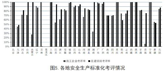 截至2019年第二季度,各地建筑施工企業安全生產標準化考評率平均為74.37%,北京市、吉林省、上海市、重慶市、西藏自治區、陜西省、寧夏回族自治區等7個省(區、市)考評率達100%;在建房屋市政工程項目考評率平均為81.6%,北京市、山西省、內蒙古自治區、上海市、福建省、湖南省、廣西壯族自治區、重慶市、西藏自治區、陜西省、寧夏回族自治區等11個省(區、市)考評率達100%。