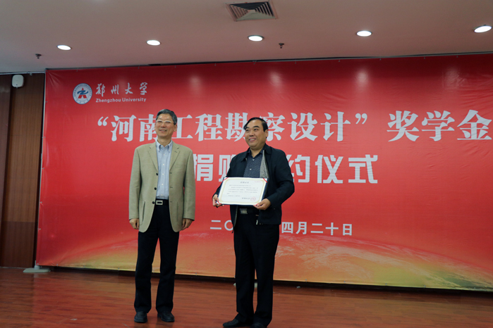 4月20日,“河南工程勘察設計”獎學金簽約儀式在鄭大校園舉行。中赟國際工程股份有限公司是捐資企業之一,公司黨委書記兼副總經理牛其志領取捐贈證書。