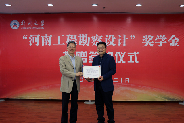 4月20日,“河南工程勘察設計”獎學金簽約儀式在鄭大校園舉行。鄭州大學綜合設計研究院有限公司是捐資企業之一,院長關罡上臺領取捐贈證書。