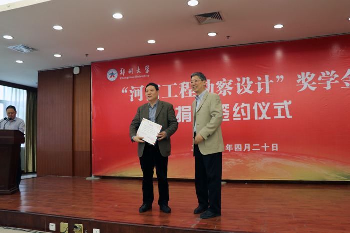4月20日,“河南工程勘察設(shè)計(jì)”獎(jiǎng)學(xué)金簽約儀式在鄭大校園舉行。河南省地礦建設(shè)工程(集團(tuán))有限公司是捐資企業(yè)之一,該公司勘察院院長(zhǎng)何留紀(jì)上臺(tái)領(lǐng)取捐贈(zèng)證書。
