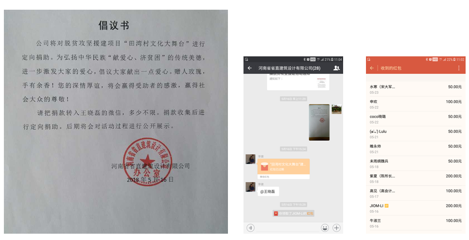 河南省省直建筑設計有限公司根據通知精神和自身實際情況,號召公司員工積極參加援建活動,奉獻愛心。員工捐款援助1285元(大寫:壹仟貳佰捌拾伍圓整),公司捐款援助4715元(大寫:肆仟柒佰壹拾伍圓整),共計捐款6000元(大寫:陸仟圓整)。該活動積極響應中央和省委精準扶貧政策精神,弘揚了企業的社會責任感,增強了員工的責任心和愛心。