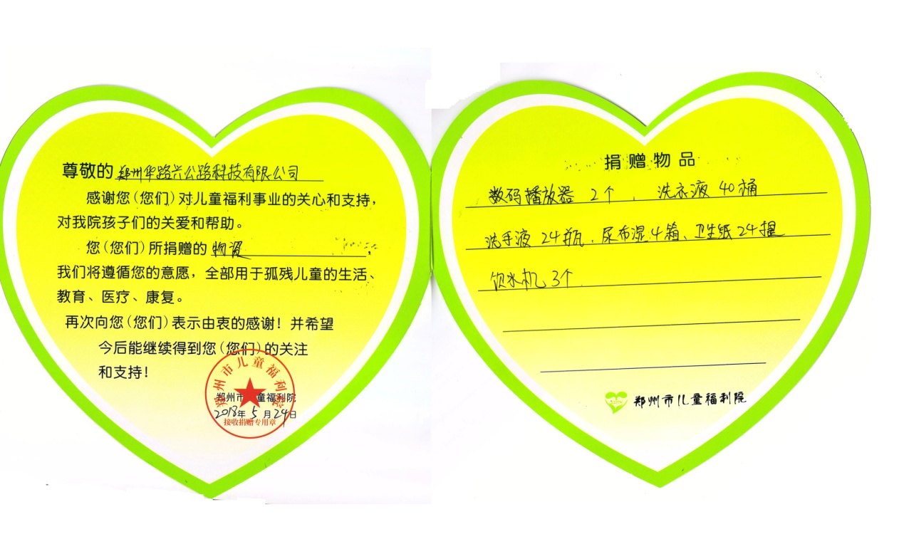 5月24日下午,在“六一”國際兒童節來臨之際,鄭州華路興公路科技有限公司到鄭州市兒童福利院開展了慶“六一”兒童節愛心公益活動,公司總經辦主任楊福安代表公司向兒童福利院捐贈了一批福利院急需的物資。