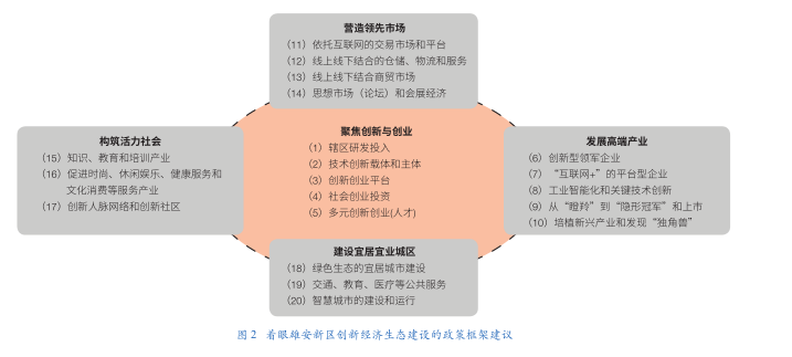 基于上述 5 大方面,對雄安新區即將開啟的創新發展政策體系建設提出以下 20條框架性政策建議(圖 2 ),并簡要說明如下。
