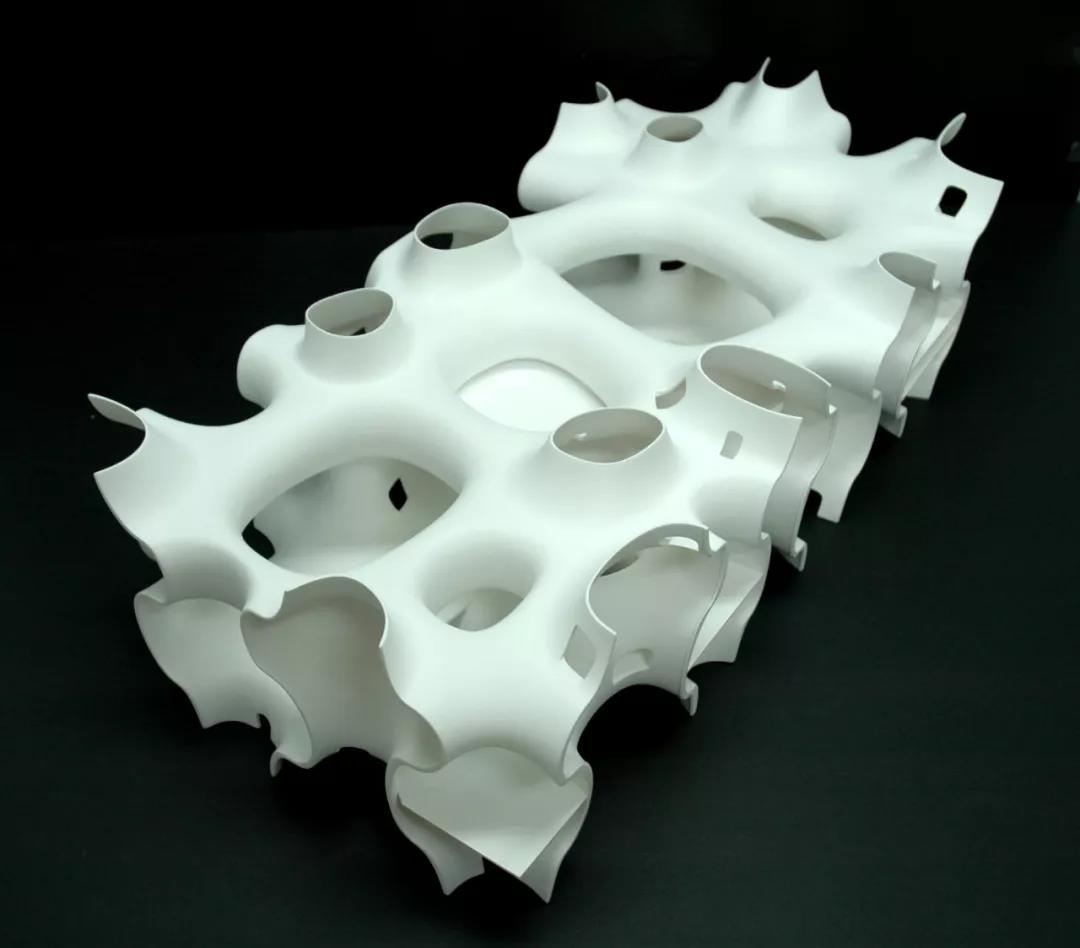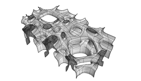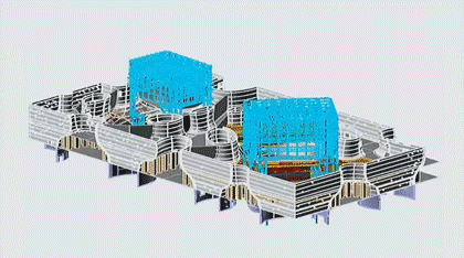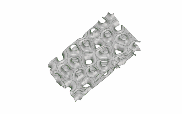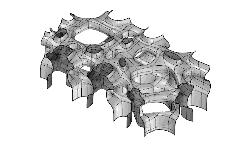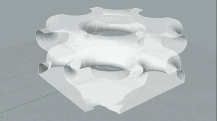 第三步,將原有位于不平面的管柱和樓板,通過曲面的方式,將原有的不同結構,融合在一個連續的三維曲面中。然后將這個單元塊,在兩個維度中復制并組合。