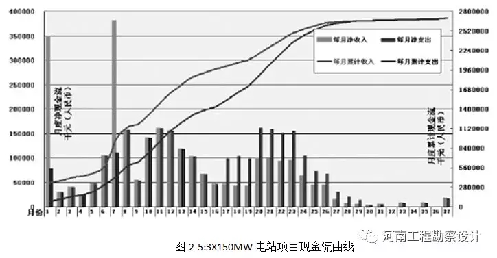 該模式對于項目的管控效果顯著,特別是在工程造價控制方面,以該項目配套工程3×150MW自備電站建設為例,用項目現金流曲線進行說明(見圖2-5)。由現金流曲線模型圖可見:項目總造價處于平衡狀態,累積收入和累積支出相等,沒有出現現金流中斷以及個別階段入不敷出需要墊資等問題。項目分別在第1月和第7月份兩次支付了預付款,業主方提供的預付款對項目進展起到良好的推動作用,豐富了項目資金儲備,保證了項目各項工作如期開展,幫助承包商及時應對可能出現的項目變更、簽證以及不可預見的情況造成的費用支出,現金流穩定性得到保證。在關鍵施工月份,例如澆筑第一方混凝土、鍋爐汽包吊裝、汽機油循環開始等月份,這些月份屬于項目關鍵節點,對工程后續開展起到承前啟后的作用,對此各參與方投入大量人力、物力、財力,調整收支計劃,保障項目的關鍵節點的推進。管理模式的改變和創新在該項目各個階段進展過程中均起到了關鍵性的作用,帶來的積極影響是技術方案的優化、經濟效益的增加,實現了工程項目全周期閉環管控。