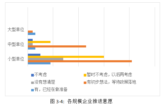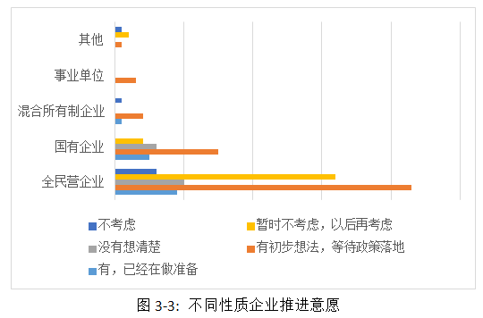 不同性質的企業在推進意愿上表現出一定的差異。全民營、國有、混合所有制企業中都有企業已經有所想法,并已開始準備,而事業單位主要持觀望態度,接受調研的事業單位全部都暫時不考慮,以后再考慮,這可能出于事業單位體制束縛,在外部資源整合方面缺乏靈活性的擔心,在目前政策還不完善的情況下,都選擇了觀望態度。同時作為本次調研企業主體的全民營企業,在推進全過程工程咨詢方面態度也是各有想法,近一半企業有初步想法,等待政策落地;其次,部分全民營企業選擇暫時不考慮,以后再考慮;少數全民營企業表示沒有想清楚;個別企業表示有意愿,已經在做準備。