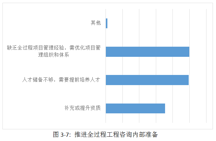 根據訪談資料整理和調查問卷統計分析結果來看,有一半以上的勘察設計企業有初步想法參與全過程工程咨詢,并且部分企業已經著手開始準備,在訪談中,多家設計院也談到自身在發展全過程工程咨詢中所做的準備。有些設計院重視BIM技術人才培養和研究。還有部分企業沒有考慮清楚,部分企業暫時不考慮,可能需要有關政策進一步明朗或落地。只有極少數企業明確不考慮。
