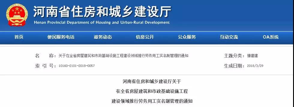 2018年3月,河南省住建廳印發《在全省房屋建筑和市政基礎設施工程建設領域推行勞務用工實名制管理的通知》(豫建建〔2018〕16號)。