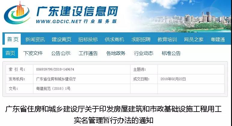 2018年2月,廣東省住建廳印發《關于印發房屋建筑和市政基礎設施工程用工實名管理暫行辦法的通知》(粵建規范〔2018〕1號)。