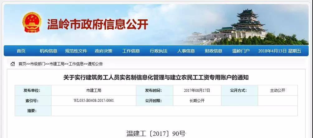 2017年10月1日起,浙江溫嶺新辦理施工許可及已辦理施工許可尚未開工的項目,必須實行建筑勞務用工實名制信息化管理。