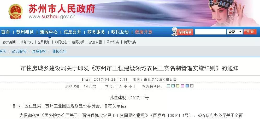 2017年4月28日,蘇州市印發《工程建設領域農民工實名制管理實施細則》。