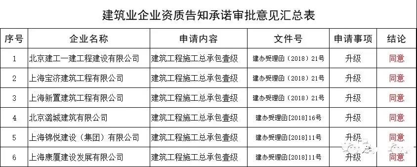 截至6月19日,住建部網站公開的《告知承諾審批意見匯總表》中,僅有6家企業的資質申請獲得通過,且申請資質均為建筑工程施工總承包壹級。