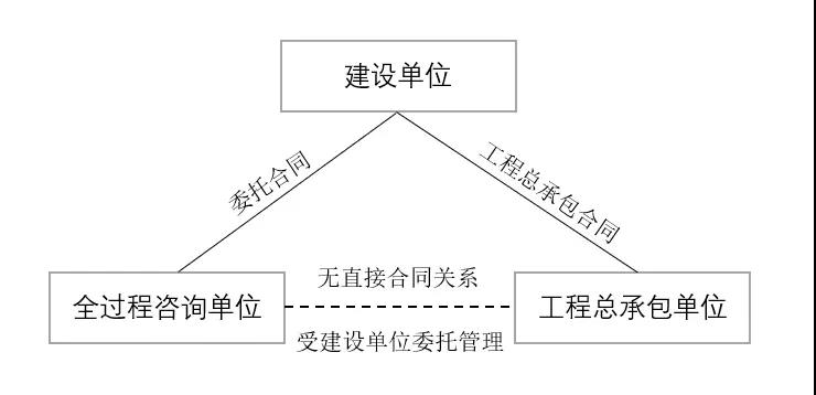 1.從法律關系上而言,全過程工程咨詢與工程總承包單位之間存在管理與被管理的關系。一般情況下,全過程工程咨詢單位受建設單位委托,按照具體的委托內容對工程提供項目建議、前期策劃、勘察設計、監理、招標代理、造價咨詢、項目竣工后評價及運營等多元化的咨詢服務,并在授權范圍內代表建設單位對工程總承包單位進行監督和管理,三方合同法律關系如下圖所示: