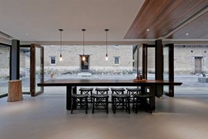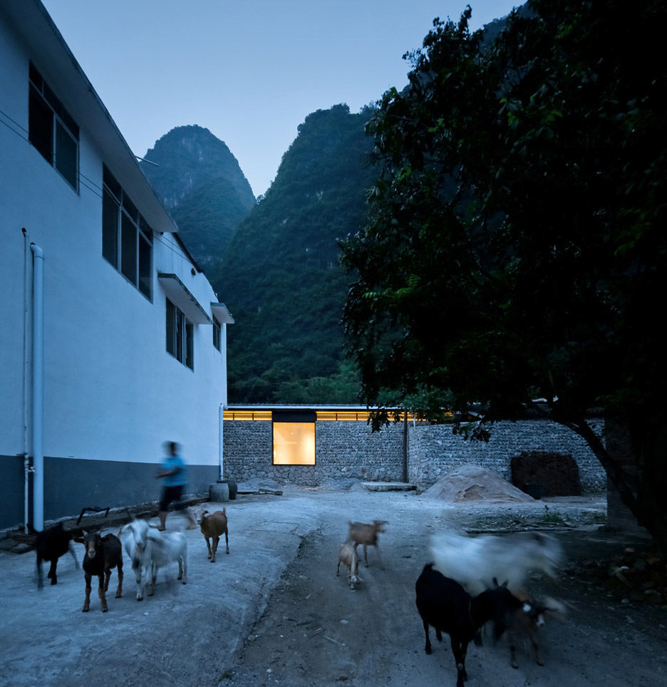 天氣好的時候,餐廳的玻璃門可以沿中軸完全打開,到了晚上,橙黃色的燈光配合青山青瓦,有家庭的感覺。