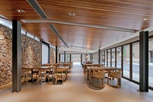“餐廳可能是客人帶最長的時間,唯一的完整的公共空間。”餐廳也是唯一的有現代感的建筑,使用了大面積的玻璃門,里外通透。室內的有變截面的鋼結構,使空間顯得有質感。