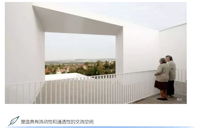 法國約納河橋村針對自理老人的92床養老院的設計,項目建筑師戴維德(David Romero Uzeda)認為:老人需要的是生活在自然光照情況下,可以自由的在建筑里面漫步。建筑設計的出發點是創造能促進人與人交流的空間,因此建筑師集中精力在休閑空間設計上,為的是創造老人的小群體交流氛圍。
